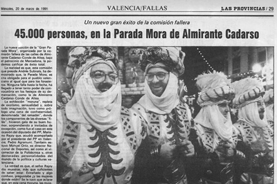 Ese año tuve el honor de ser el pregonero de la Parada Mora; discurso que desarrollé montado en un bello y nervioso ejemplar equino que se asustaba con las explosiones del tró de bac y a mi me subía y bajaba la cena. Al final todo salió bien, no me caí del caballo y en el cruce de las calles Almirante Cadarso con Conde Altea, al lado del monumento fallero y frente a la tribuna de autoridades solté toda la perorata.