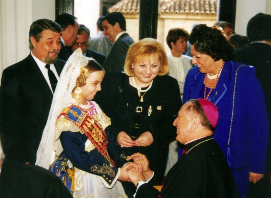 A continuación y junto con su corte de honor tuvo lugar una ofrenda de flores a la Virgen. La parte más entrañable y motivo de mi orgullo personal tuvo lugar durante el desayuno en la Casa Vestuario, con asistencia del entonces presidente de la Generalitat, Eduardo Zaplana; la alcaldesa, Rita Barberá; el presidente de la Diputación, Manuel Tarancón; Juan Cotino, director general de la Policía y el actor Antonio Ferrandis, mantenedor de Lucía Andrés.