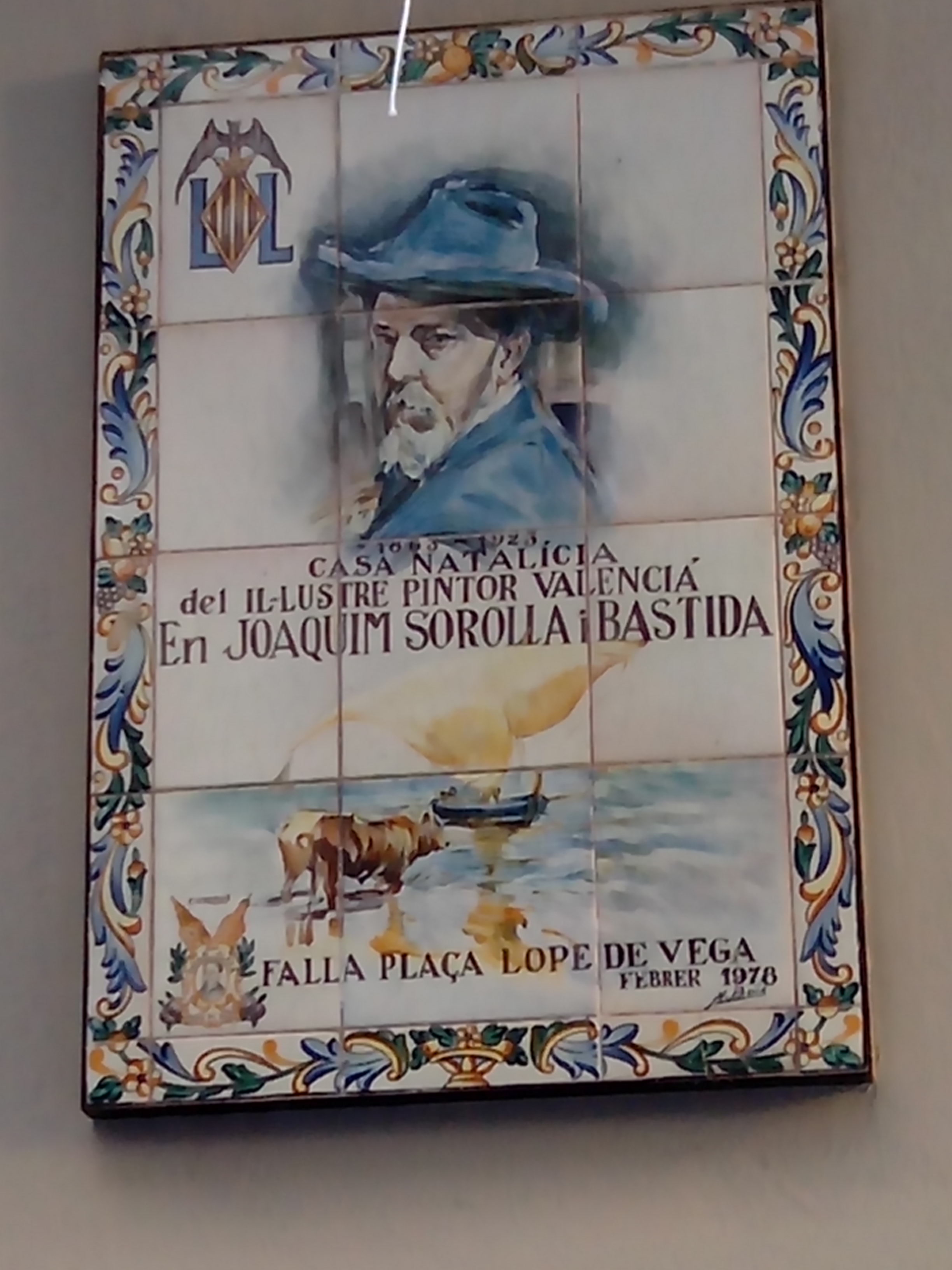 Pues bien ese testimonio, muy importante para los valencianos, es iniciativa de la cercana falla Plaza de Lope de Vega que en el año 1978 colocó en la planta baja del edificio. En la cerámica podemos contemplar un dibujo de uno de los autorretratos del pintor y una escena de playa. En el texto podemos leer: “1863-1923 Casa natalicia del ilustre pintor valenciano Joaquín Sorolla Bastida. Falla Lope de Vega- febrero de 1978”